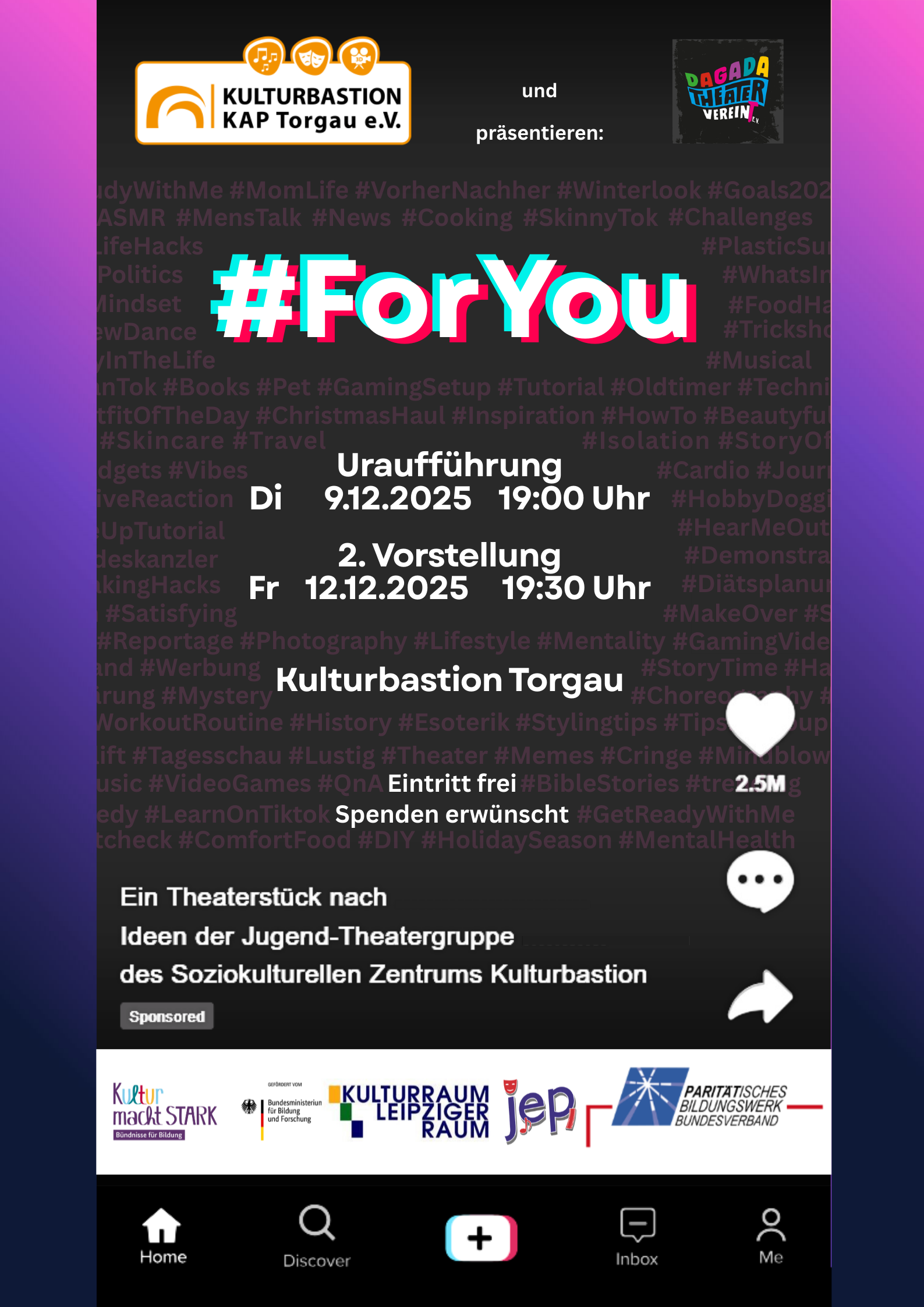 Von August bis Dezember arbeitete ich im Auftrag der Kulturbastion Torgau mit der dortigen Jugend-Theatergruppe an einer Stückentwicklung. Erst zum vorgegebenen Thema Wald (was wir nach einigen Wochen aufgaben) und dann zum deutlich aktuelleren Thema Social Media und deren Einfluss auf Mädchen* bzw. Frauen*. Die vier Spieler:innen und ich entwickelten viele verschiedene Charaktere, realitätsgetreue Reels, Influencer-Content, absurde Szenen uvm. und brachten diese mit jeweils ca. 30 Sekunden Laufzeit auf den Punkt. Später kamen noch drei Gast-Spielerinnen hinzu, die das Video-Kontingent erweiterten bzw. die Rahmenhandlung für die rund 60 TikToks übernahmen. Am 9.12. und 12.12. führten wir das Stück schließlich vor jungem wie älterem, begeisterten Publikum auf und waren hinterher sichtlich stolz auf unser Werk, die Umsetzung mit einfachsten Mitteln und das Teamwork in der Gruppe.